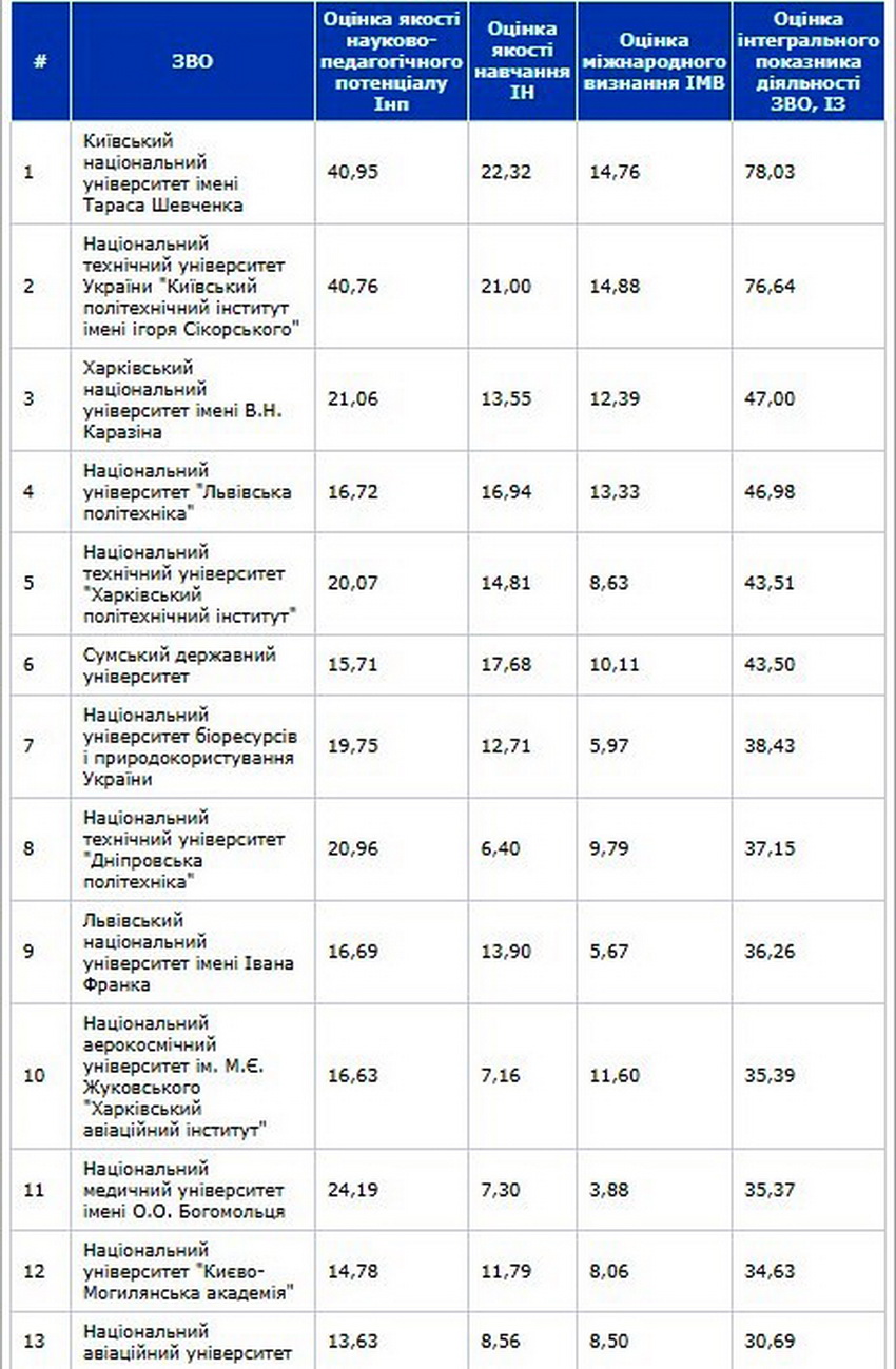 У трійці лідерів рейтингу – Київський національний університет імені Тараса Шевченка, Національний технічний університет України «Київський політехнічний інститут імені Ігоря Сікорського» та Харківський національний університет імені В.Н. Каразіна.