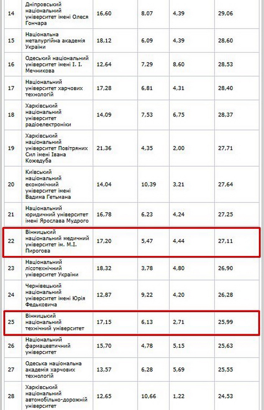Найкращу позицію має Вінницький національний медичний університет ім. М.І. Пирогова – 22 місце.
