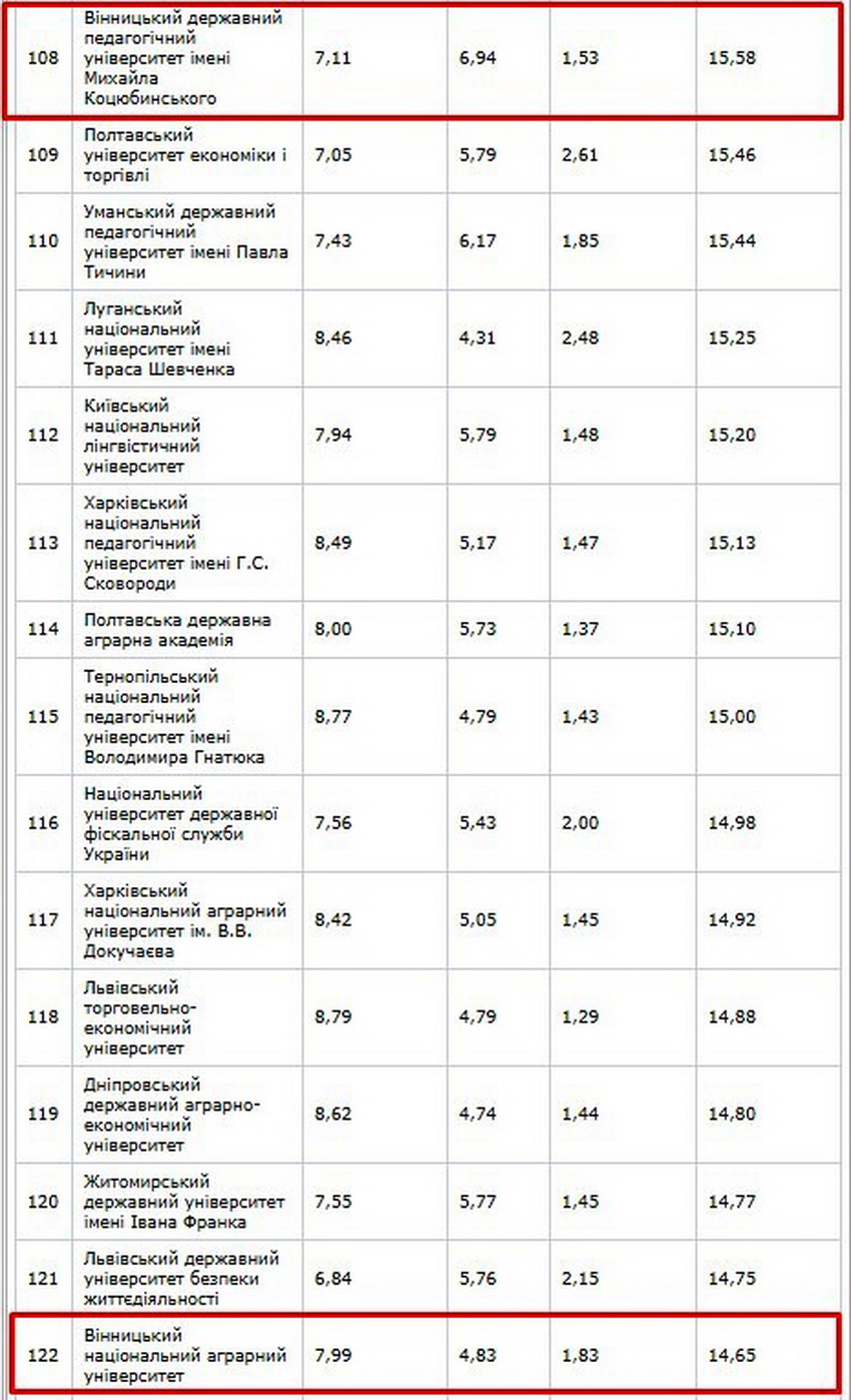 Вінницький державний педагогічний університет імені Михайла Коцюбинського – 108 місце.
