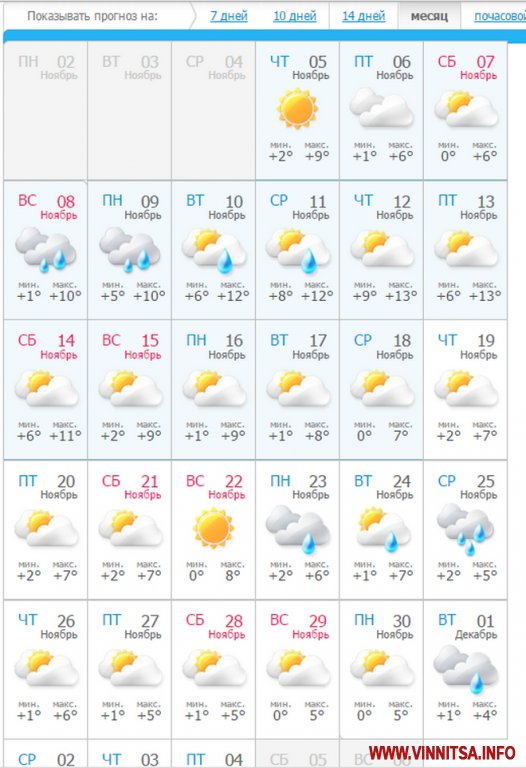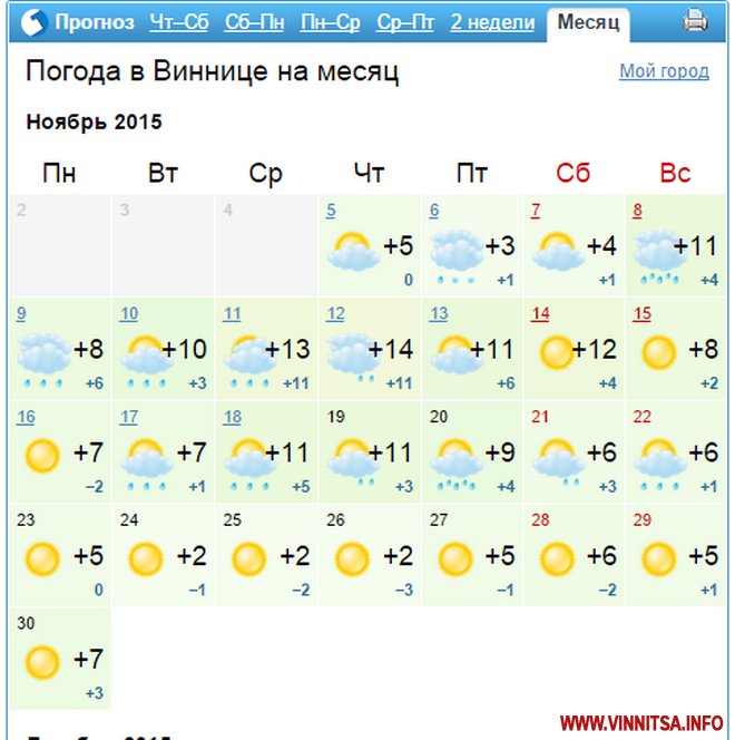Сніг восени вінничани, швидше за все, не побачать. За прогнозами синоптиків, листопад обіцяє бути дощовим і, порівняно, нехолодним. Лише в останній тиждень місяця передбачаються заморозки нижче 3 градусів за Цельсієм з позначкою мінус.