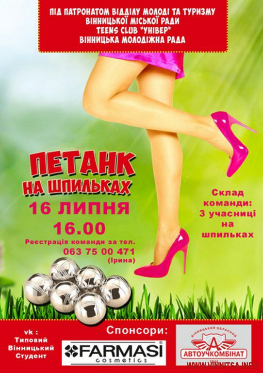 16 липня у Вінниці відбудеться змагання з петанку на шпильках. Захід проходитиме на набережній «Рошен». Участь у ньому можуть взяти всі бажаючі представниці прекрасної статі.