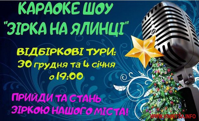 30 грудня грудня о 19.00 відбудеться перший відбірковий тур кaрaоке-шоу «Зіркa нa Ялинці». Другий тур пройде 4 січня о 19.00.
