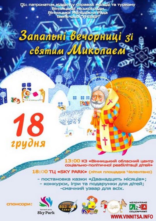 У четвер у ТЦ «Sky Park» на літній площадці піцерії «Челентано» о 18-ій годині розпочнуться запальні вечорниці зі Святим Миколаєм. Тут буде демонструватись вистава «Дванадцять місяців». Крім того можна буде взяти участь у різноманітних конкурсах, іграх та отримати подарунки. Також вінничан там частуватимуть теплим смачним узваром.