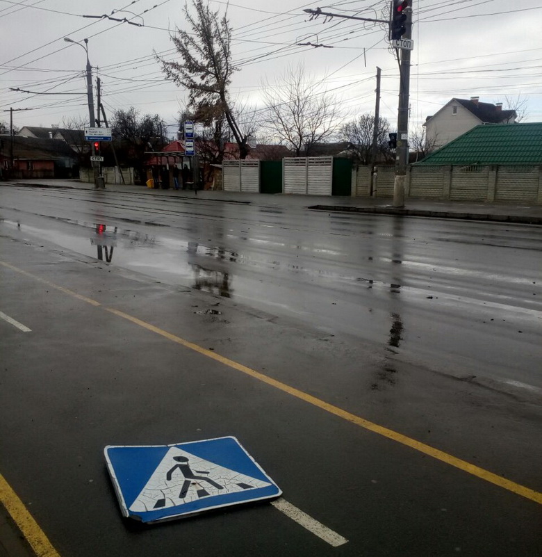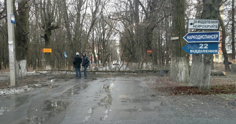 На території лікарні ім. Ющенка поперек пішохідної доріжки вітер повалив дерево, біля Кумбар зірвав проводи, на Гонти зірваний вітром дорожній знак валяється на дорозі, а на Поділлі похилився білборд з виборчою агітацією.
