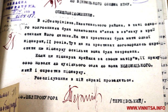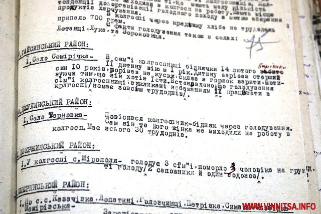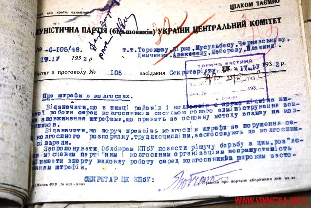 Щорічно, в останню суботу листопада, Україна вшановує жертв Голодоморів. Їх в державі було кілька, наймасштабніший – в 1932-1933 роках. До 85-ї річниці Вінницький обласний державний архів показав розсекречені в часи незалежності документи. Це тисячі справ із страшними спогадами, так званими планами на експорт і повідомленнями про початок розслідування через хрещення, вбивства та крадіжки. Кожен другий документ із написом «Совершенно секретно». У деяких листах навіть зазначено, що після прочитання його треба спалити.