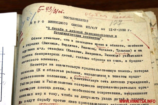 Обком отмечает, что в последнее время в области, особенно в городах (Винница, Бердичев, Каменец, Тульчин) и на крупных ж-д станциях (Казатин, Жмеренка, Винница), увеличился приток бездомных детей, главным образом из села и бродяжнического элемента».