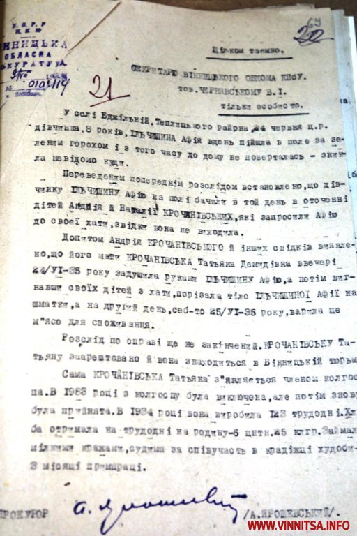 Село Кошаринці «Дівчина 9 років зарізана колгоспницею – біднячкою вдовою з метою вживання як харчі».