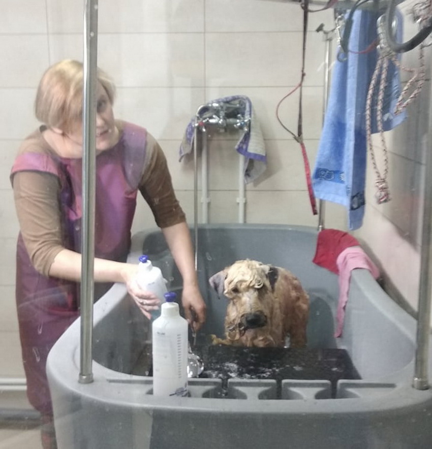На прийом до Галини привели Стешу. Так звати рідкісної породи ірландського пшеничного тер’єра. Собаці також наносять оновлювальну, лікувальну маску для шкіри та шерсті. Це обов’язкові процедури перед купанням в озоновій ванні.