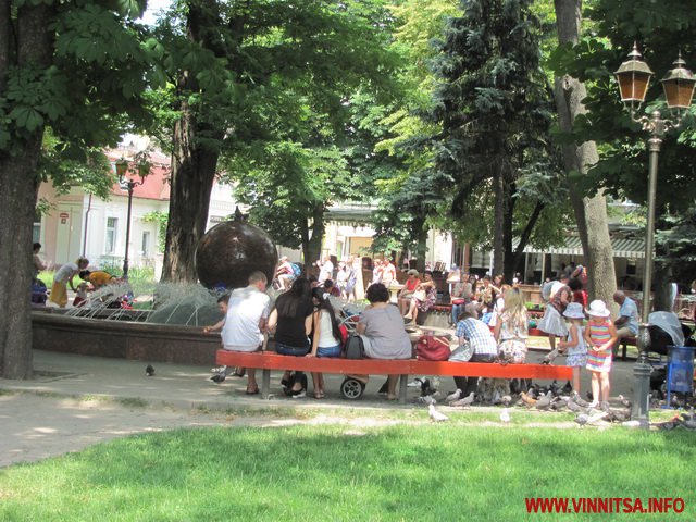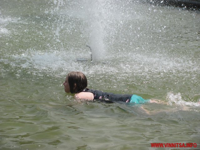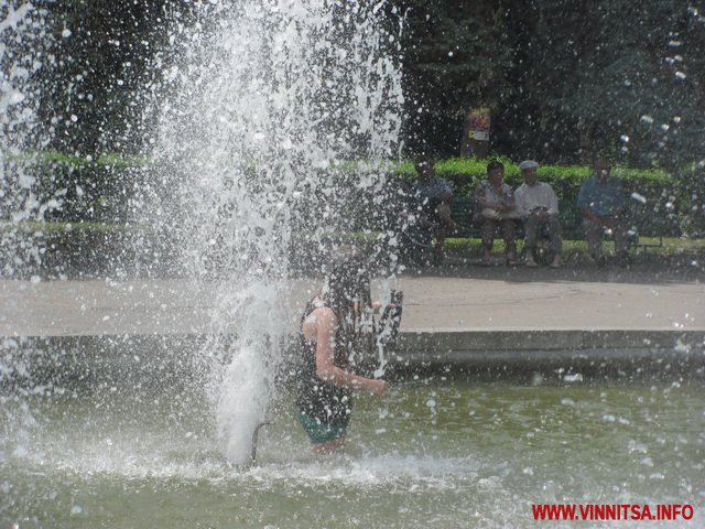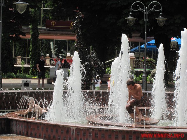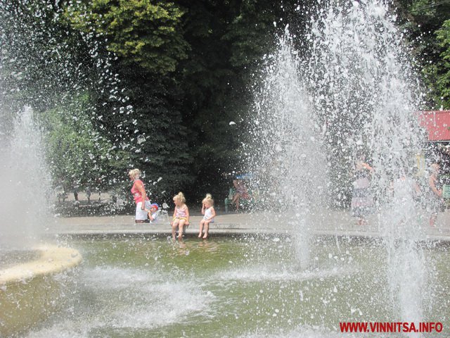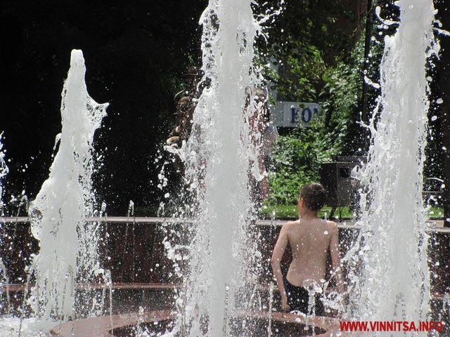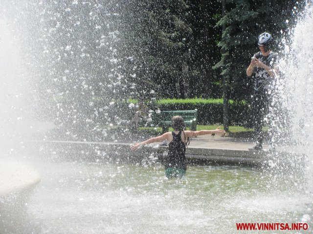 27 червня стовпчики термометрів у Вінниці піднялися за позначку 30 градусів вище нуля. Спека у місті дається в знаки: на вулиця малолюдно, зате в парку і біля фонтанів чимало відпочиваючих. Щодо водограїв, то діти перетворили їх на басейни: стрибають у воду і плавають.