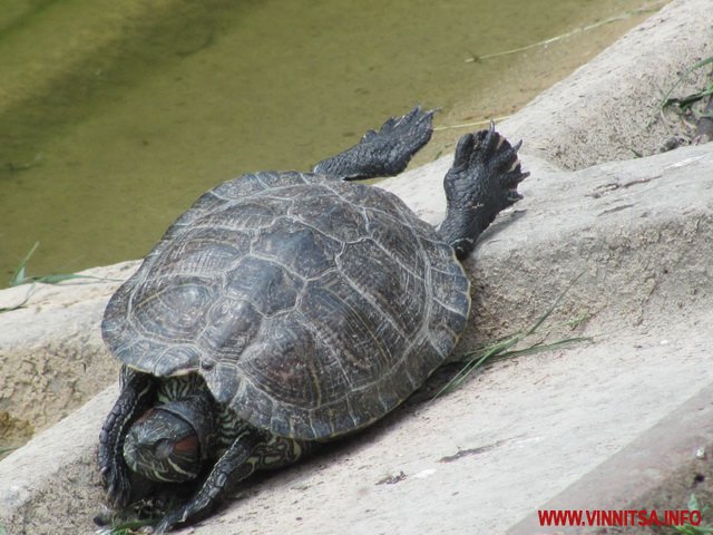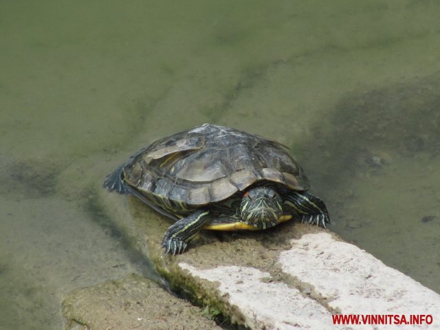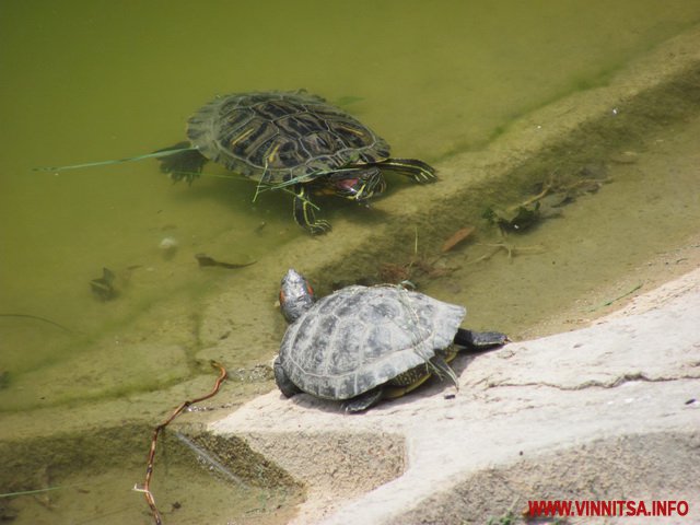 В озері, що біля Центрального парку черепашки влаштували собі пляж. На розпечених сонцем плитах видніється з десяток панцерів. Схоже, рептиліям, спека до сподоби, адже жодна з них не ховається у холодок.