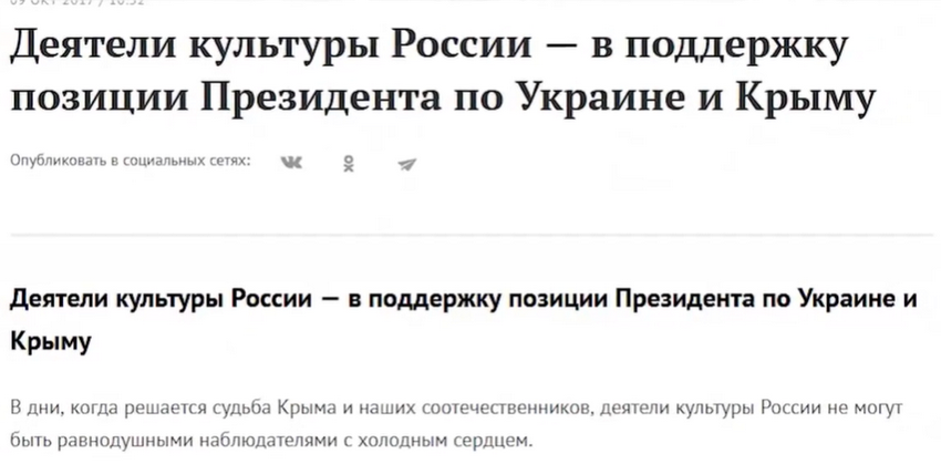 «За отриманими від спецслужб даними, російський кіно продюсер, генеральний продюсер однієї з кінокомпаній, є одним з підписантів звернення діячів культури росії в підтримку президента щодо України та Криму в березні 2014 року.