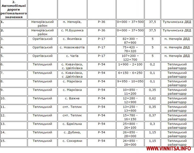 Перелік ділянок автомобільних доріг державного значення на території Вінницької області, на яких найбільш ймовірні утворення транспортних заторів внаслідок снігових заметів