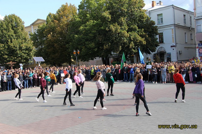 Студенти Вінницьких університетів та коледжів під час свята на Європейській площі обласного центру демонстрували свою вправність у спортивних танцях, показували акробатичні вміння та залучали до рухової активності усіх учасників заходу.