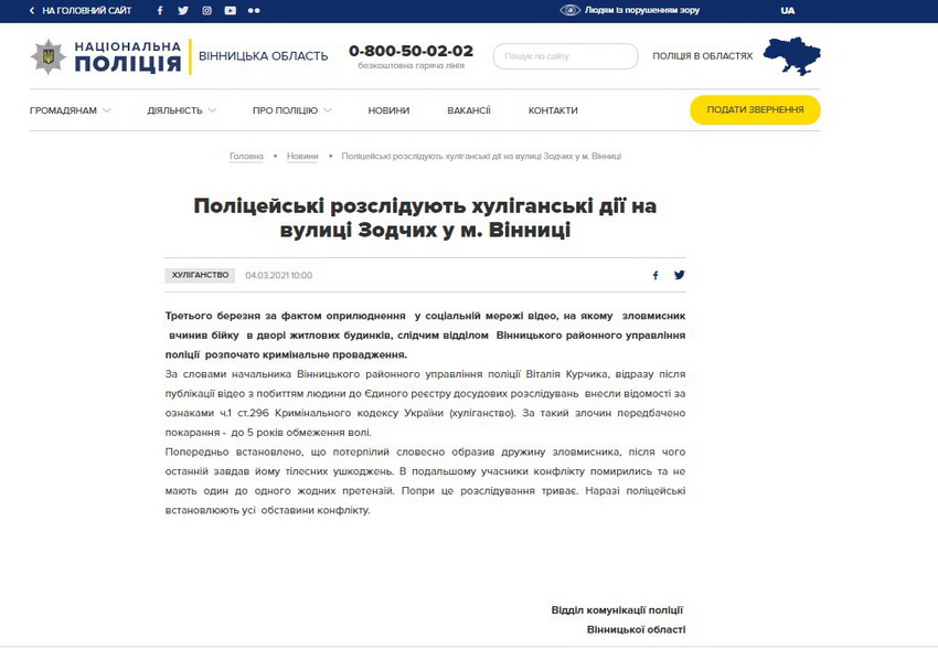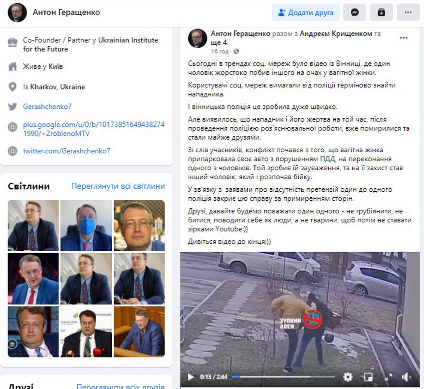 «Сьогодні в трендах соцмереж було відео із Вінниці, де один чоловік жорстоко побив іншого на очах у вагітної жінки. Користувачі соцмереж вимагали від поліції терміново знайти нападника. І вінницька поліція це зробила дуже швидко. Але виявилось, що нападник і його жертва на той час, після проведення поліцією роз’яснювальної роботи, вже помирилися та стали майже друзями. Зі слів учасників, конфлікт почався з того, що вагітна жінка припарковала своє авто з порушенням ПДД, на переконання одного з чоловіків. Той зробив їй зауваження, та на її захист став інший чоловік, який і розпочав бійку.У зв’язку ззаявами про відсутність претензій один до одного поліція закриє цю справу за примиренням сторін», - написав він на своїй сторінці у «Фейсбук».