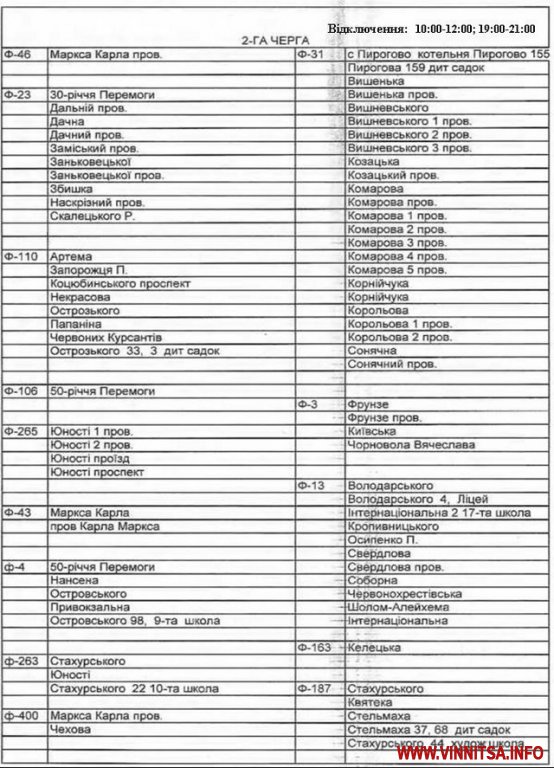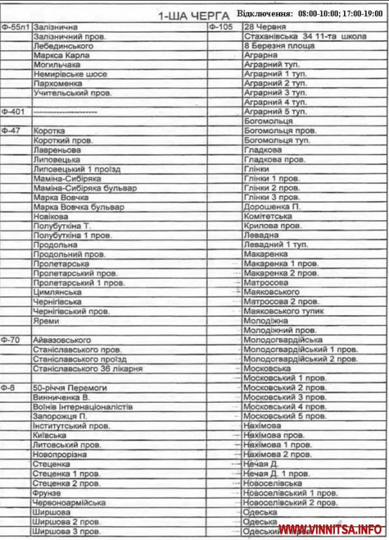 Графік складається із двох черг: вулиці, які увійшли до 1-ї черги будуть відключатись з 08:00 до 10:00 та з 17:00 до 19:00, а ті, що до другоїчерги - з 10:00 до 12:00 та з 19:00 до 21:00