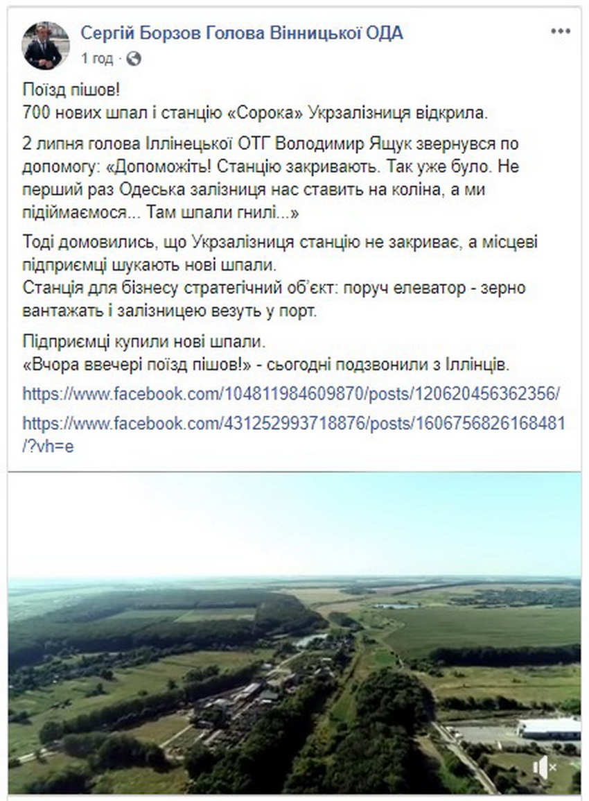«За спряння голови обласної державної адміністрації Сергія Борзова відновлено роботу залізничної дільниці Оратів-станція Сорока. З відповідним проханням допомогти у вирішені цього питання звернувся до керівника області Іллінецький міський голова Володимир Ящук. Було ухвалено компромісне рішення спільними зусиллями Укрзалізниці та підприємств, які здійснюють свою господарську діяльність з використанням залізничних перевезень через станцію Сорока, провестти ремонт та заміну залізничних колій. Ремонтні роботи завершено та відновлено вантажні перевезення, що важливо для забезпечення ефективної діяльності багатьох підприємств Іллінецької міської ОТГ», – повідомляють в дописі.