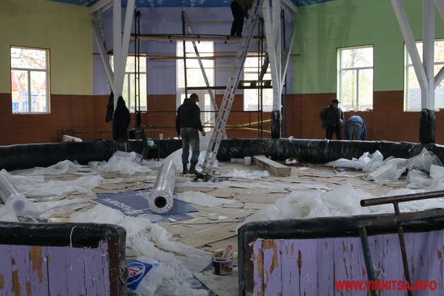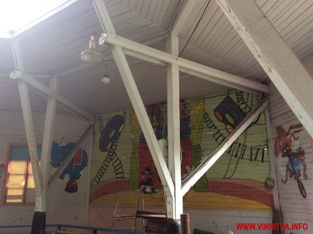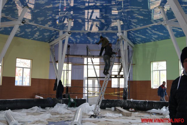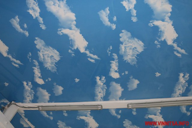 Підрядники перефарбували стіни та приступили до монтажу стелі. Раніше всередині будівлі було природнє освітлення за рахунок мансардних вікон, зараз – монтують натяжну стелю з хмаринками.