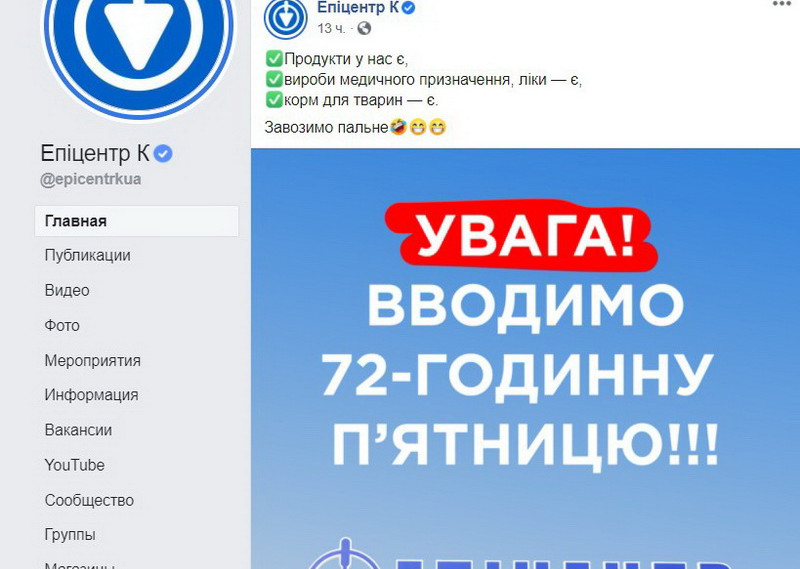 Після запровадження Урядом карантину «вихідного дня», яким заборонена робота торгових центрів та магазинів, крім продуктових, аптек і АЗС. На сторінці «Епіцентру» в Facebook опублікували допис: «Продукти у нас є, вироби медичного призначення, ліки - є,корм для тварин - є. Завозимо пальне». І додали картинку: «Увага! Вводимо 72-годинну п'ятницю!!!».