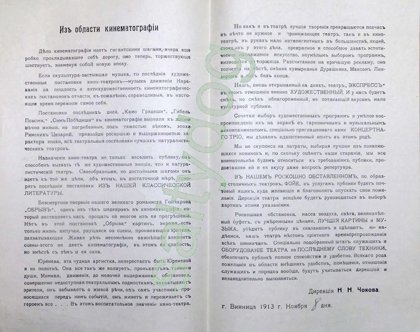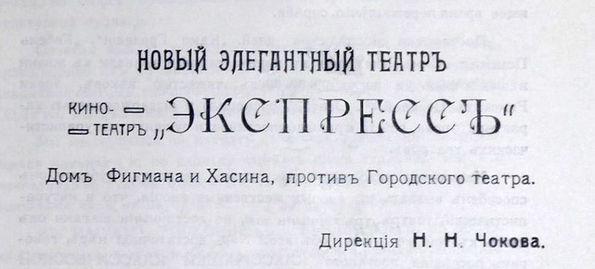 Цікаво, що «Експрес» одразу позиціонував себе кінотеатром для вибагливого глядача і не збирався вдовольняти смаки малоосвіченої публіки. Про це йдеться в рекламній брошурі 1913-го року. Пропонуємо вам її переклад.