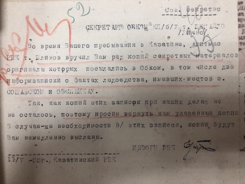 «В селе Казатин колхозник Шкильняк Дмитрий имел 300 трудодней, он вместе с семьей лежат опухшие.