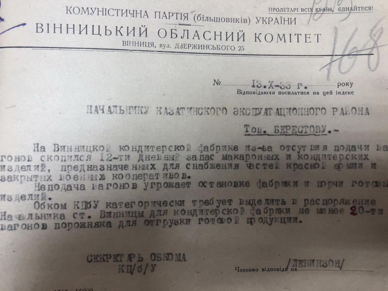 В той же період часу в жовтні 1933 року у Вінниці на кондитерській фабриці зібрався 12 денний запас макаронних та кондитерських виробів для червоної армії. Вінницький обласний комітет компартії направляв лист начальнику Козятинського експлуатаційного район з вимогою дати 20 вагонів для відвантаження продукції.