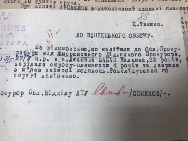 «За відомостями, які надійшли до облпрокуратури від Жмеринського дільничного прокурора 27 травня цього року в с. Лисянка Бабак Маланія, 33 роки, зарізала сироту-племінницю, 4 роки та зварила з м’яса забитої холодець. Розслідування по справі закінчено».