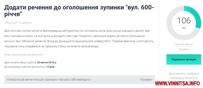 «Для того, аби гостям міста та безпосередньо абітурієнтам, які не знають міста, було легше знаходити ДонНУ або вони принаймні знали, на якій зупинці виходити, аби туди потрапити, пропоную додати до тексту оголошення зупинки «вул. 600-річчя» речення «Вихід до Донецького національного університету». Подібна практика у місті досить поширена, тому сподіваюся на підтримку з боку жителів та органів влади», - йдеться в петиції до міської ради, яку подав студент вишу Дмитро Головченко.