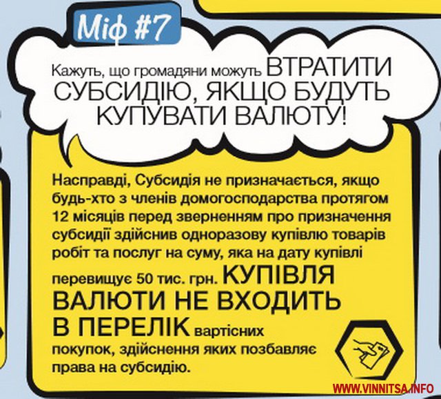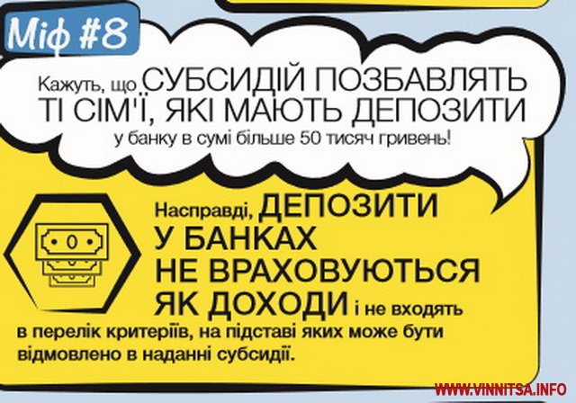 На право призначення субсидії не впливає наявність майна, земельної ділянки, паю, корови, тощо… Призначення субсидії впливає на доходи. Якщо це майно приносить дохід (здається в оренду – уточ.), дохід буде врахований при розрахунку субсидії. На право призначення субсидії не впливають ні машини, ні кілька будинків. Але субсидія призначається лише на той будинок чи квартиру, де особа зареєстрована, на інші призначити не можливо. Не впливає на право призначення субсидій наявність заборгованості по житлово-комунальних послугах, не впливає наявність депозиту. Відсотки від депозитів не враховуються до сукупного доходу і не впливають на субсидію. Купівля валюти не впливає теж, навіть, якщо це купівля валюти на суму більше як 50 тисяч гривень. Продаж квартири не впливає на право, але дохід від продажу квартири буде врахований на наступний період», - повідомила Валентина Войтенко.