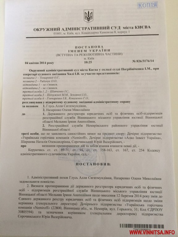 Окружной административный суд г.Киева 4 апреля признал незаконным внесение в госреестр сведений о Юрии Сорочинском как генеральном директоре ДП «УВК «Nemiroff». Суд принял во внимание, что изменения в ЕГРУ были внесены госрегистратором вопреки Определению Хозяйственного суда г.Киева от 4 марта 2014 года, запретившим любые изменения относительно ДП «УВК «Nemiroff» в госреестре.