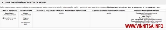 У щорічній декларації судді за 2015 рік зазначено, що посадовець має у власності «Volkswagen passat» 2010 року випуску, який був придбаний у березні 2015 року за 147439 гривень.