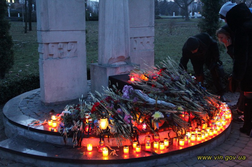Напередодні Дня вшанування пам`яті жертв голодоморів у Вінниці біля пам`ятника на площі імені Василя Стуса вінничани хвилиною мовчання вшанували пам`ять загиблих в часі голодомору 1932 -1933 років, поклали квіти та запалили свічку пам`яті на знак шани невинно покараних душ.