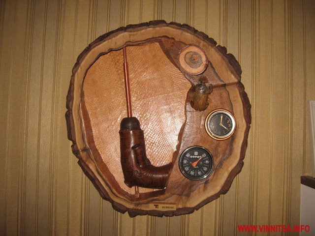 Великий обріз зі стовбура горіхового дерева на стіні, де відразу красуються, здавалося б несумісні речі (самостріл, старий годинник, старого зразка спідометр і скарабей) - втілює образ нашого життя. Це як куля випущена в життєві перешкоди, швидкість у всіх цих подорожах різна і часовий простір у кожного свій. А скарабей, це образ сенсу життя, і нагадування про його швидкоплинність», - розповідає чоловік.