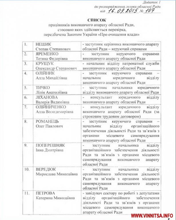 Стосовно працівників виконавчого апарату Вінницької обласної ради з 1 жовтня 2015 року почнуть проводити перевірку, передбачену Законом України «Про очищення влади».