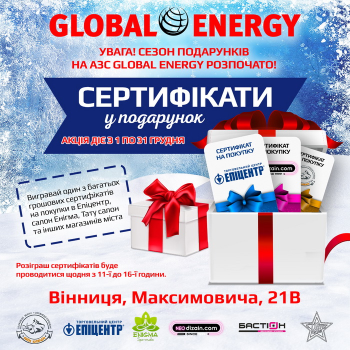Саме час зануритися «з головою» в святкову атмосферу! Заправляйся на Global Energy і вигравай один з багатьох грошових сертифікатів на покупки в «Епіцентрі», салоні «Енігма», тату-салоні та інших магазинах міста.