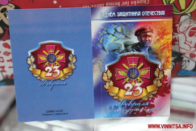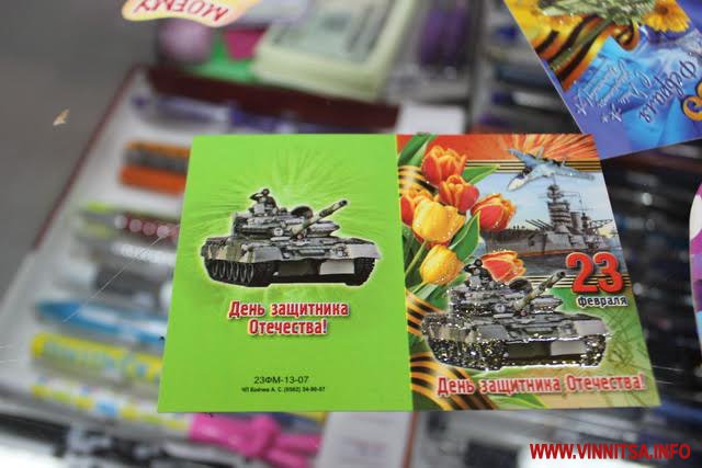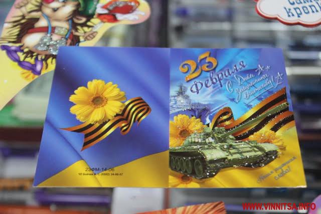 23 лютого у Вінниці на розкладках та магазинах канцтоварів продають вітальні листівки з привітанням до «Дня за щитника отечества».