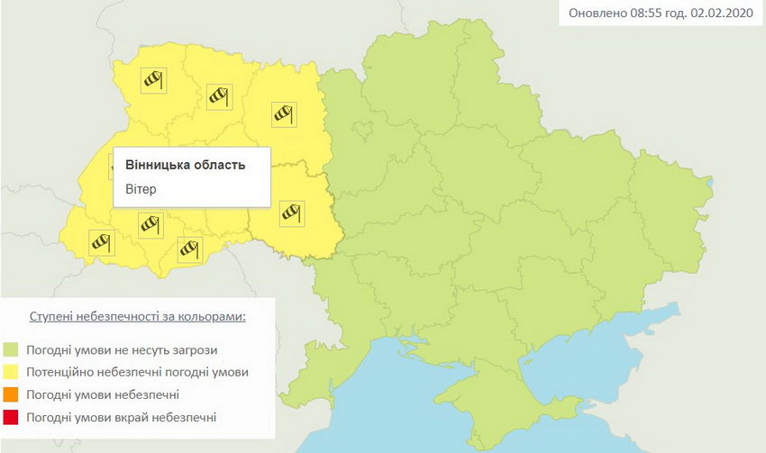 За прогнозами Укргідрометцентру, вдень 2 лютого у західних, Вінницькій та Житомирській областях пориви вітру 15-20 м/с, в Карпатах 25 м/с Визначили І рівень небезпечності - жовтий.