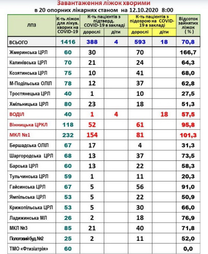 Станом на ранок 13 жовтня, у 20 опорних лікарнях Вінницької області на стаціонарі із підтвердженим COVID-19 перебуває 368 дорослих та 4 дитини. З підозрою на коронавірус – 553 дорослих та 22 дитини. За минулу добу COVID-19 вперше виявлено у 89 осіб. Зафіксовано 1 летальний випадок. Коронавірус виявлено: