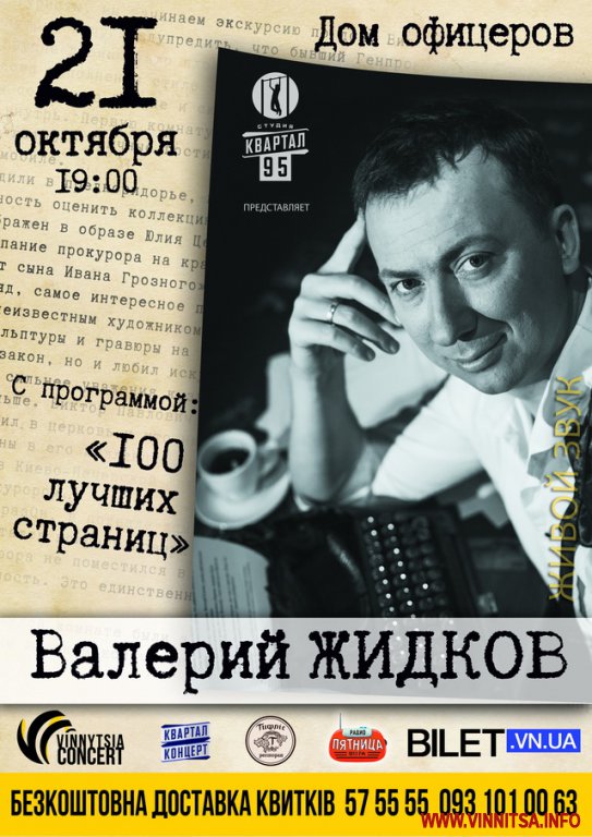 21 жовтня на концерті Валерія Жидкова «100 кращих сторінок» у вінницькому Будинку офіцерів буде чесно, гостро і незабутньо. Приходьте, аби досхочу насолодитися інтелігентним та актуальним літературним гумором одного з кращих авторів-гумористів сучасності. Рівень ендорфінів цього вечора підійметься до максимального рівня!