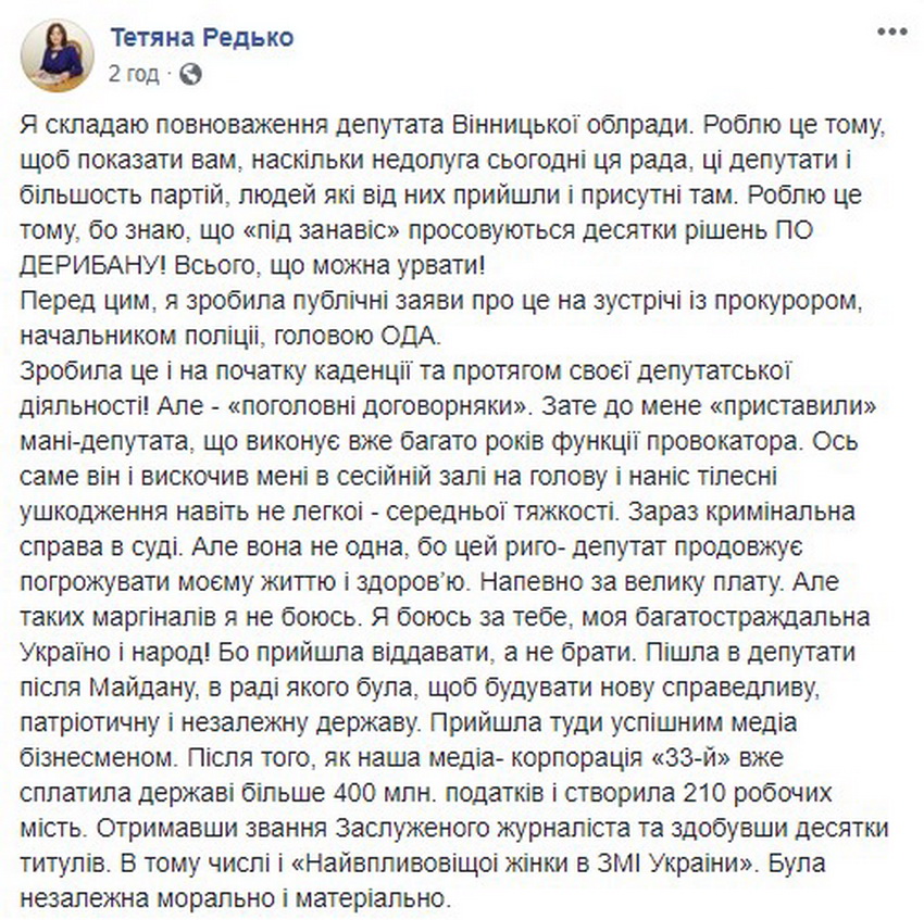 Депутатка і власниця газети «33 канал» Тетяна Редько заявила, що складає повноваження депутата Вінницької обласної ради. Також Редько заявила, що «вийшла із «Батьківщини».