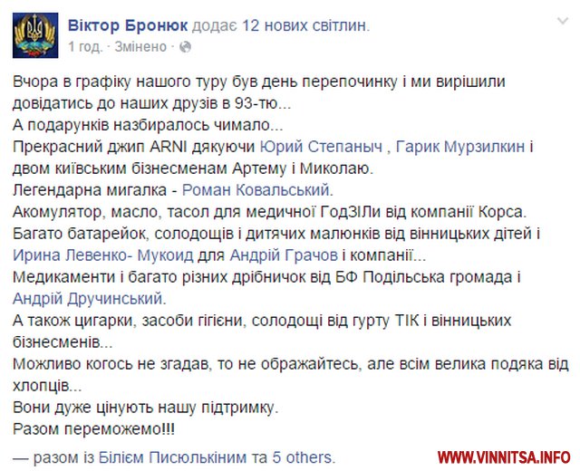 24 лютого гурт «ТІК» та Віктор Бронюк привезли допомогу українським бійцям 93-ї окремої механізованої бригади. Про це лідер гурту написав на своїй сторінці у Facebook.