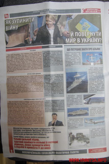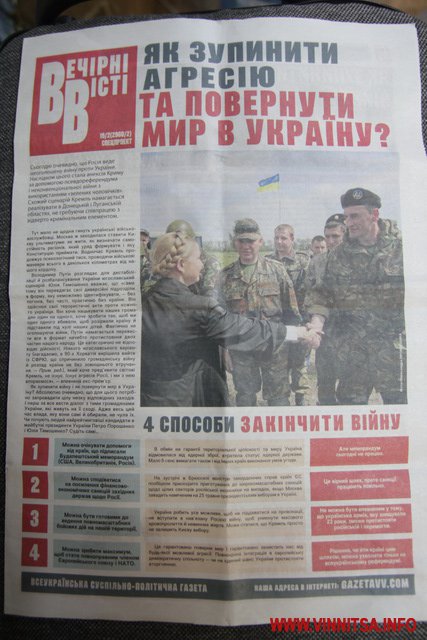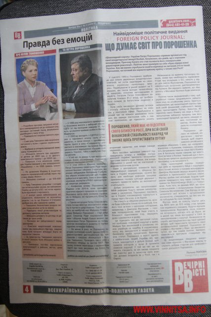За 4 дні до виборів Президента України у Вінниці черговий виток розповсюдження «чорнухи» на лідера виборчої кампанії Петра Порошенка з боку представників штабу Юлії Тимошенко. Після стотисячних викидів «чорнухи» через «Нову вінницьку газету» колишнього керівника міського муніципального видання Тараса Борисюка та «Голосу народу» від Віктора Маліновського чергова порція «інформаційного лайна» вилита вже через «партійну бютівську» газету «Вечірні Вісті» з Києва, яку до обласного центру завезли тиражем, що йомовірно у декілька разів перевищує офіційні дані.