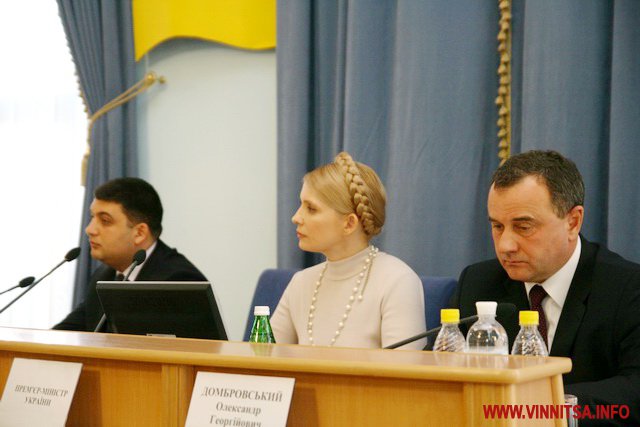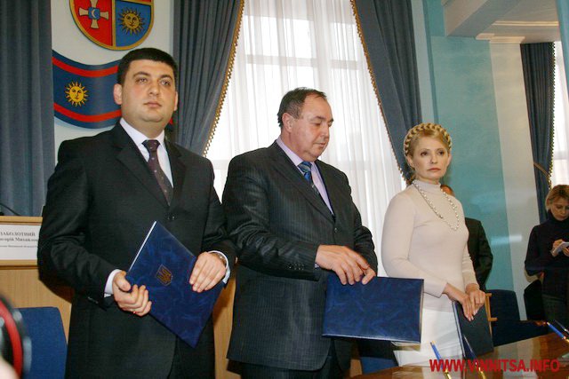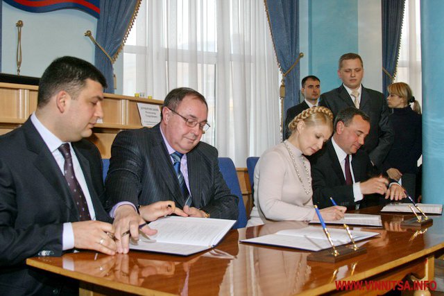 «…Вінниця стала кінцевим пунктом робочого візиту Прем’єр-міністра Юлії Тимошенко, а підписання «протоколу намірів» з трьома «китами» місцевої влади – завершальною крапкою перебування в області. Протокол намірів про підготовку Угоди щодо регіонального розвитку Вінницької області був підписаний увечері, після 19-ї години. А з самого ранку Юлія Тимошенко побувала у Гайсинському районі: їздила та ходила буряковими полями Олексія Порошенка і цехами Гайсинського цукрозаводу. Саме Герой України Порошенко-старший став першим, кого похвалила і чию роботу у цукровиробництві високо оцінила Юлія Тимошенко. Приємно «червоніли» й губернатор Олександр Домбровський, голова обласної Ради Григорій Заболотний та мер Вінниці Володимир Гройсман.
