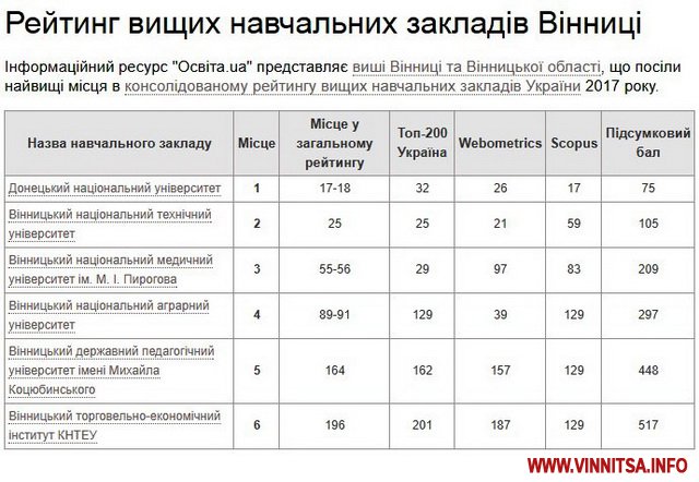 Інформaційний ресурс «Освітa.ua» предстaвив виші Вінниці тa облaсті, що посіли нaйвищі місця в консолідовaному рейтингу вузів Укрaїни 2017 року.
