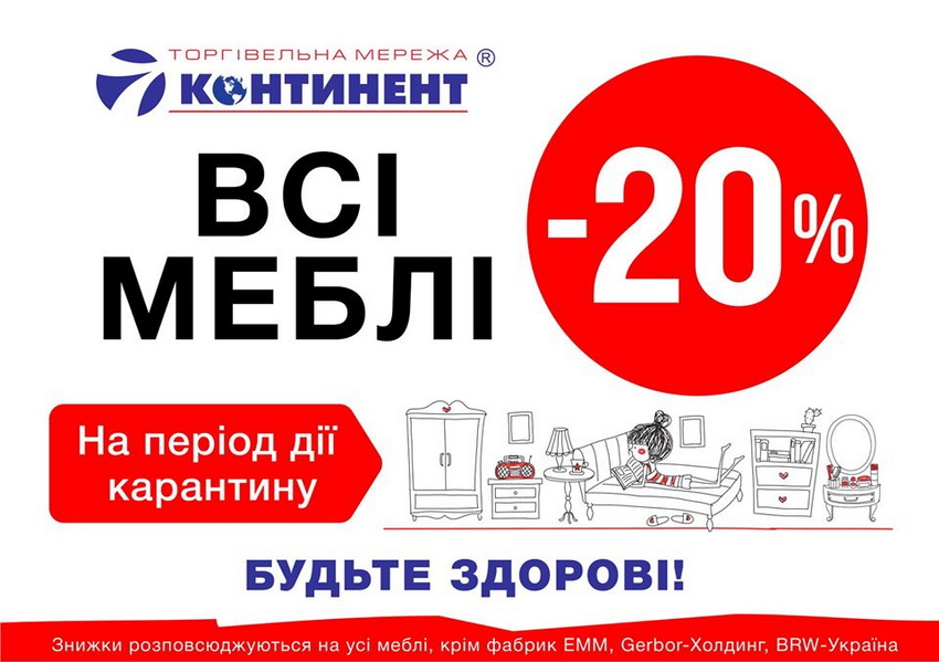 Розуміючи що вже витрачено чимало коштів на ліки, продукти, запаси товарів першої необхідності, а також незручності дистанційного замовлення «7 континент» оголошує знижку 20% на весь товар (крім продукції фабрик БРВ, Герборг - холдинг, ЕММ, ARS, VIT - у них власні рекомендовані ціни та акції) та рекомендує дотримуватися правил карантину, берегти себе і рідних.