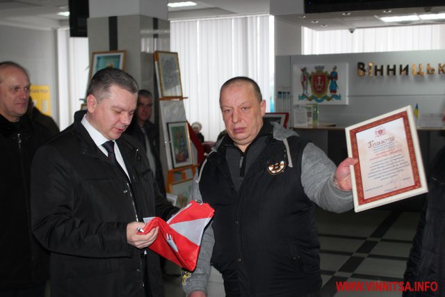 В.о. мера Вінниці Сергій Моргунов вручив волонтерам подяку за небайдужість та прапор міста, який доручив передати на передову.