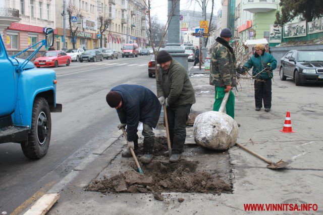 Працівники КП «Вінницязеленбуд» висаджують вздовж проїжджої частини вулиці Соборної великомірні молоді липи у тих місцях, де дозволяє ширина тротуару. Нові дерева з’являться на відрізку дороги від вулиці Визволення до Архітектора Артинова. Вони не заважатимуть руху пішоходів та механічному прибиранню тротуару у зимовий період».