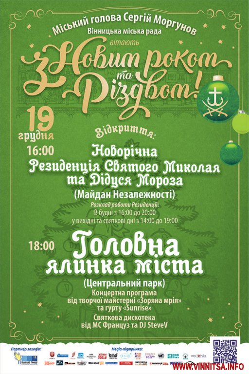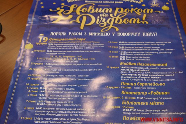 «Основними локаціями, традиційно є Центральний парк, Майдан Незалежності та Європейська площа. На Майдані Незалежності традиційно буде Новорічно-Різдвяна резиденція. Окрім того, там буде встановлена ялинка, та вперше у Вінниці обладнають вертеп. На Європейській площі традиційно працюватиме Різдвяний ярмарок. Головні заходи будуть в центральному парку – біля ялинки. В цьому році ми змінили каркас ялинки. Вона легша та іншої конфігурації. Крім того на ялинці частково замінено ілюмінацію та нові іграшки. Ялинка буде в іншому вигляді буде цікаво, для Вінниці і для гостей міста», - розповів мер Вінниці.