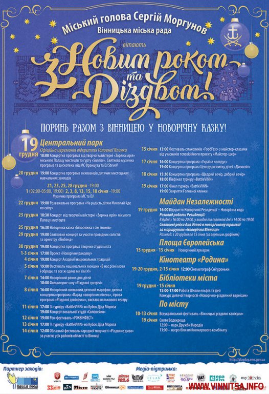 Протягом місяці з 19 грудня по 19 січня у Вінниці відзначатимуть Новорічні та Різдвяні свята. Цього року повністю зміниться центральна ялинка, вона буде з новими іграшками та гірляндами в трьох кольорах срібний, червоний і золотий. Соборну освітлять новою ілюмінацією, прикрасять гірляндами також в’їзди у Вінницю. Щодо програми святкувань, то окрім традиційної ходи Дідів Морозів, цього року у Вінниці проведуть фестиваль вуличної їжі FoodFest з зірками проекту «Майстер шеф» та облаштують вертеп біля мерії.