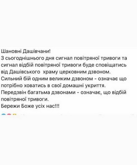"Сигнал повітряної тривоги та сигнал відбій повітряної тривоги буде сповіщатись від Дашівського храму церковним дзвоном. Сильний бій одним великим дзвоном - означає, що потрібно ховатись по своїм домашнім укриттям. Передзвін багатьма дзвонами - відбій повітряної тривоги", - повідомляють серед мешканців села Дашів.
