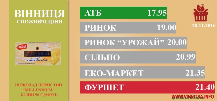 АТБ, пр. Юності, 51, ЕКО-маркет пр. Юності, 18, Сільпо, вул. Келецька, 105, Фуршет, Хмельницьке шосе, 145-б, Ринок «Урожай», вул. Пирогова, 50 а, Ринок, вул. Некрасова, 48.